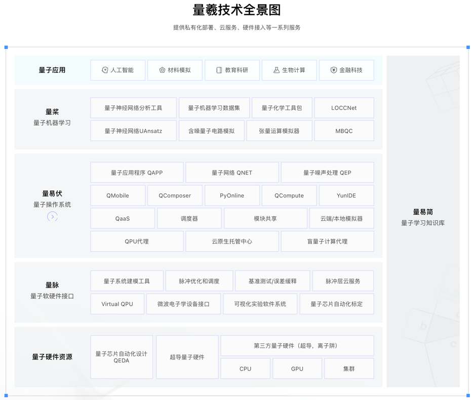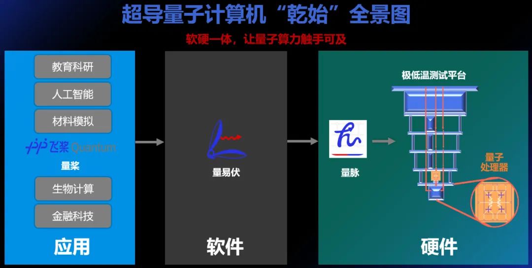 囊括了由自研工业级量子测控平台量脉和量子芯片设计等组成的硬件平台,还拥有专门针对量子硬件进行优化的自研量子操作系统量易伏和量桨等应用开发工具