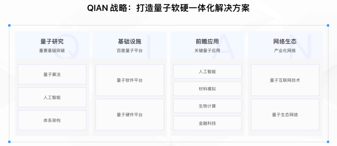 具体地讲,QIAN 分别代表了百度在量子基础研究突破(Quantum)、量子软硬件基础设施建设(Infrastructure)、量子计算关键应用研发与落地(Application)以及量子产业化网络生态构建(Network)等四个方面的全新战略布局。