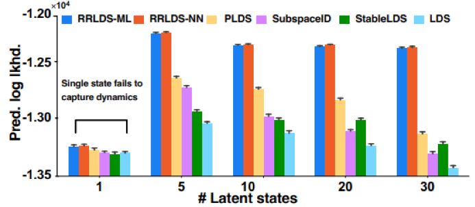 我们在模拟数据和真实世界数据的基准方法上对我们的框架进行了评估。出色的表现说明我们的方法:(1) 能够自动减少隐含状态空间的冗余维度,从而防止与大量预定义隐含状态过拟合;(2) 相比于基准方法,能显著提升预测有噪声神经尖峰活动的表现;(3) 能稳健且有效地检索来自两个实验数据集的基础复杂神经系统的固有维度。
