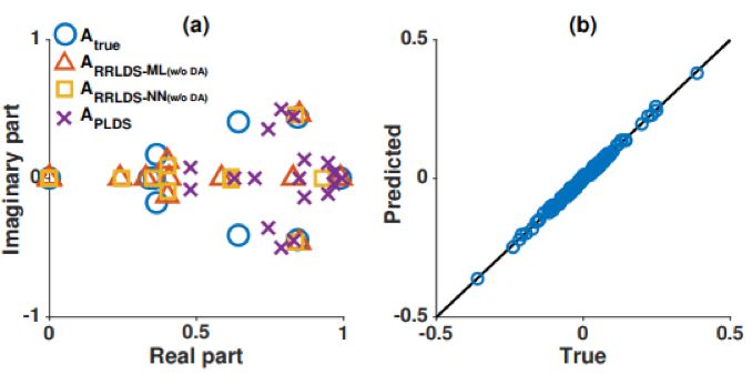 图 5:使用 RRLDS-ML(红色三角形)、RRLDS-NN(黄色正方形)和带有泊松观察模型的 LDS(PLDS,紫色叉号)评估的动态矩阵的谱(spectrum)。真实的复杂特征值谱用蓝色圆圈表示。RRLDS-ML 和 RRLDS-NN 方法(没有 DA)的接近于真实特征值,而 PLDS 无法消除冗余的维度。(b) 预测得到的和真实的计数数据的平稳协方差矩阵中的元素的散点图。