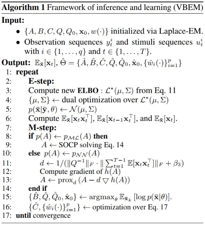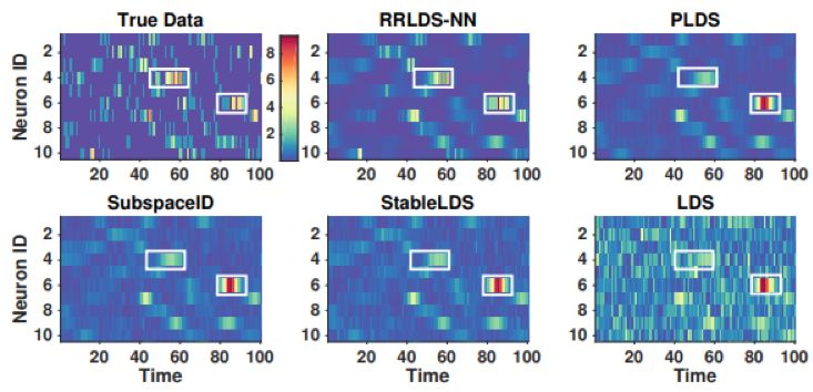 解析高维时间序列的隐含结构是人工智能领域的基本问题之一,并且已经在从社会、经济到生物科学等各种领域得到了广泛的应用(Linderman, Stock, and Adams 2014; She, So, and Chan 2015; She, Chen, and Chan 2016; So et al. 2016; Hein et al. 2016)。在这样的情况中,很多研究和理论都认为高维时间序列是某些基本的、低维的、随时间变化的相关信号的有噪声观察结果(Pfau, Pnevmatikakis, and Paninski 2013; Archer et al. 2014; Sussillo et al. 2016)。人们已经将线性动态系统(LDS)用于从被观察的多元时间序列数据中提取低维的隐含网络结构(Archer et al. 2014; Lakshmanan et al. 2015; Linderman et al. 2017),这能得到观察结果的变化性质,不管是空间上的还是时间上的。