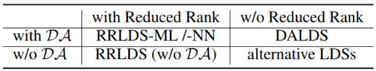 表 2:我们的方法与多个基准方法的缩写。ML 表示多元拉普拉斯,NN 表示核范数。alternative LDS 方法包含单纯的 LDS(Ghahramani and Hinton 1996)、PLDS(Buesing, Macke, and Sahani 2012)、SubspaceID(Van Overschee and De Moor 2012)和 StableLDS(Boots, Gordon, and Siddiqi 2007)