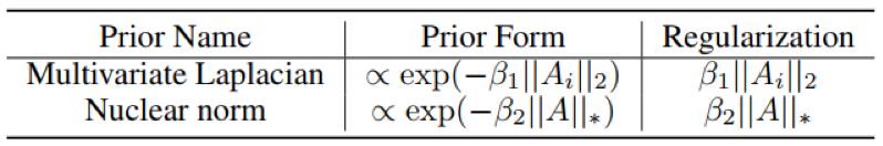 为了通过动态矩阵 A 的秩而从 MTS 数据集恢复固有的维度,我们应该选择能够诱导出预期的低秩性质的特定先验。我们有两种引导低秩动态矩阵的选择:(1) 多元拉普拉斯先验,(2) 核范数先验。如表 1 所示: