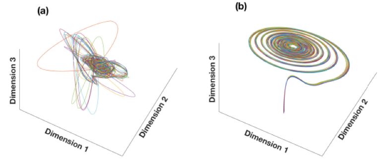 图 1:根据 (a) 无约束的动态矩阵和 (b) 降秩动态矩阵所重建的隐含轨迹(不同的颜色表示不同的模拟试验)。(b) 中的低维流形更加平滑且构建得更好。