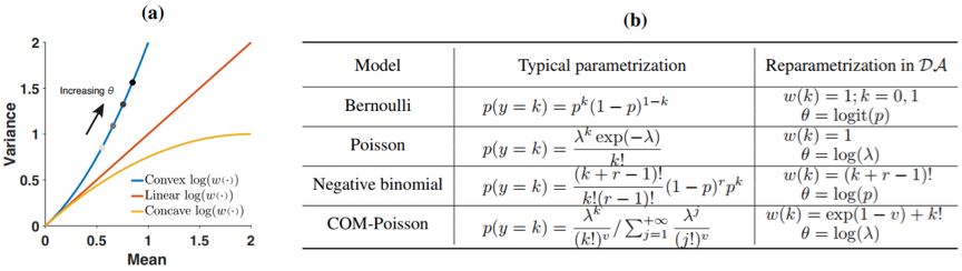 图 2:(a) 函数 w(·) 的不同选择的 DA 分布的均值和方差。当 log w(·) 固定时,增大θ会使均值和方差更大(更黑的点);(b) 通过参数化 θ 和 w(·) 而得到的 DA 分布的常见计数分布特例。