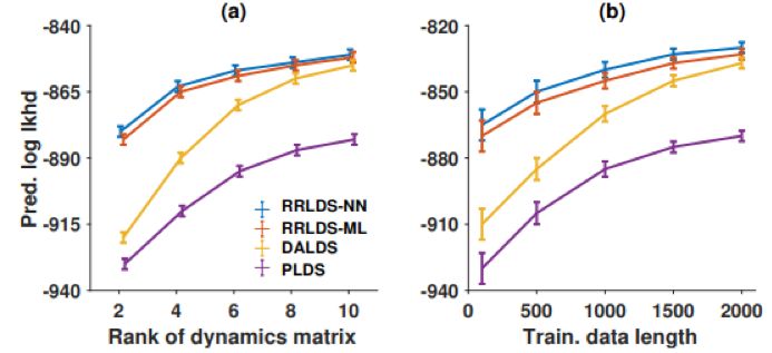 图 6:(a) 使用不同的动态矩阵真实秩学习到的 4 个 LDS 的预测对数似然,(b) 使用不同长度的训练数据学习到 4 个秩为 5 的 LDS 的预测对数似然。(a) 和 (b) 中预定义的隐含状态数量都是 10。RRLDS-ML 和 RRLDS-NN 都显著(p<0.001,配对 t 检验)超越了其它方法。