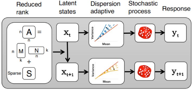 有了两种降秩结构和 DA 分布,现在我们可以将它们与一个隐含的线性动态系统耦合起来。我们将这个系统称为 RRLDS,该系统有利于建模有限的计数数据来检索固有维度。我们将其用于建模在大脑神经元上记录到的时间序列数据(尖峰计数),而且也可以简单直接地将其用于描述和解读其它计数过程的观察值。