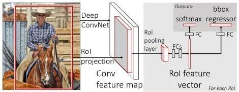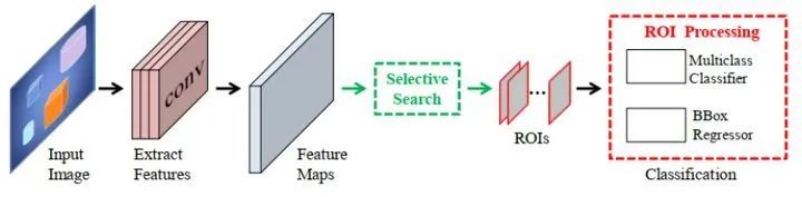 RCNN集成了AlexNet和使用选择性搜索技术的区域方案。RCNN模型的训练包括以下步骤。第一步涉及计算使用选择性搜索获得的类不可知区域建议。下一步是CNN模型微调,包括使用区域建议微调预先训练的CNN模型,如AlexNet。接下来,利用CNN提取的特征来训练一组类特异性支持向量机(SVM)分类器,该分类器取代了通过微调学习的softmax分类器。然后使用CNN获得的特征对每个对象类进行类特异性边界盒回归训练。