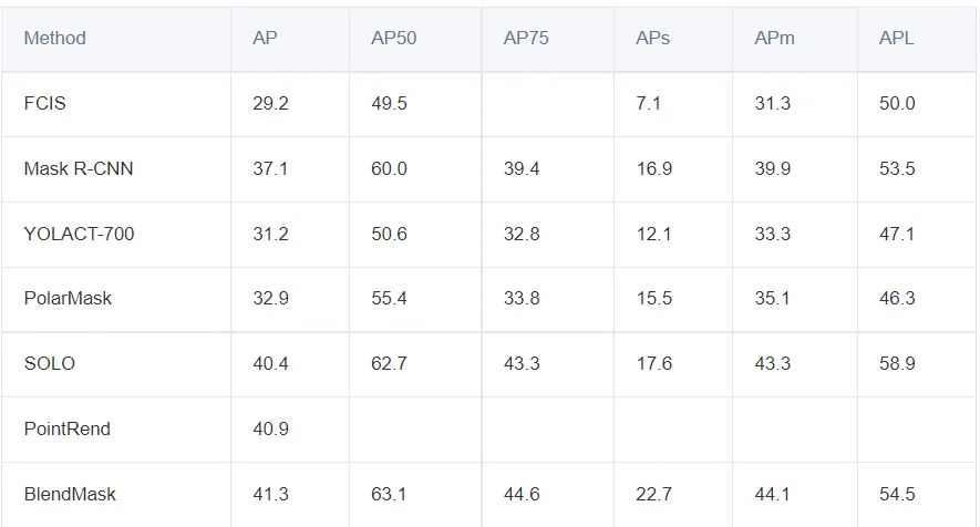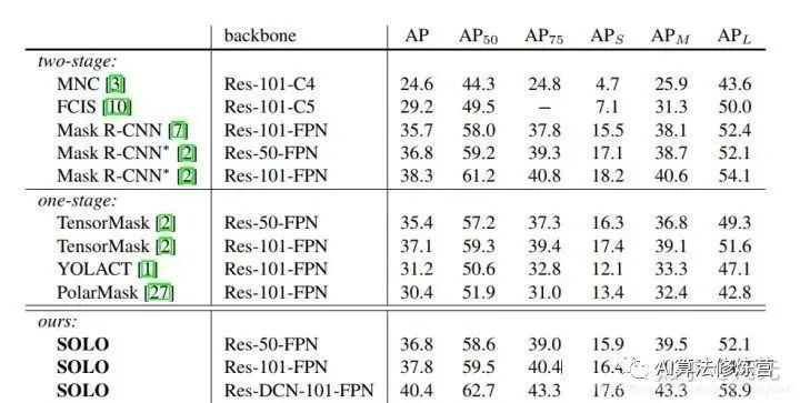 SOLO的精度已经超越了Mask R-CNN,相较思路类似的PolarMask也有较大的优势。