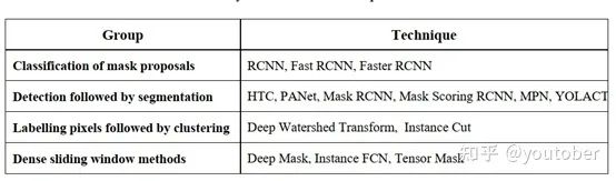 主要有四种:掩模建议分类法、先检测再分割法、标记像素后聚类法和密集滑动窗口法