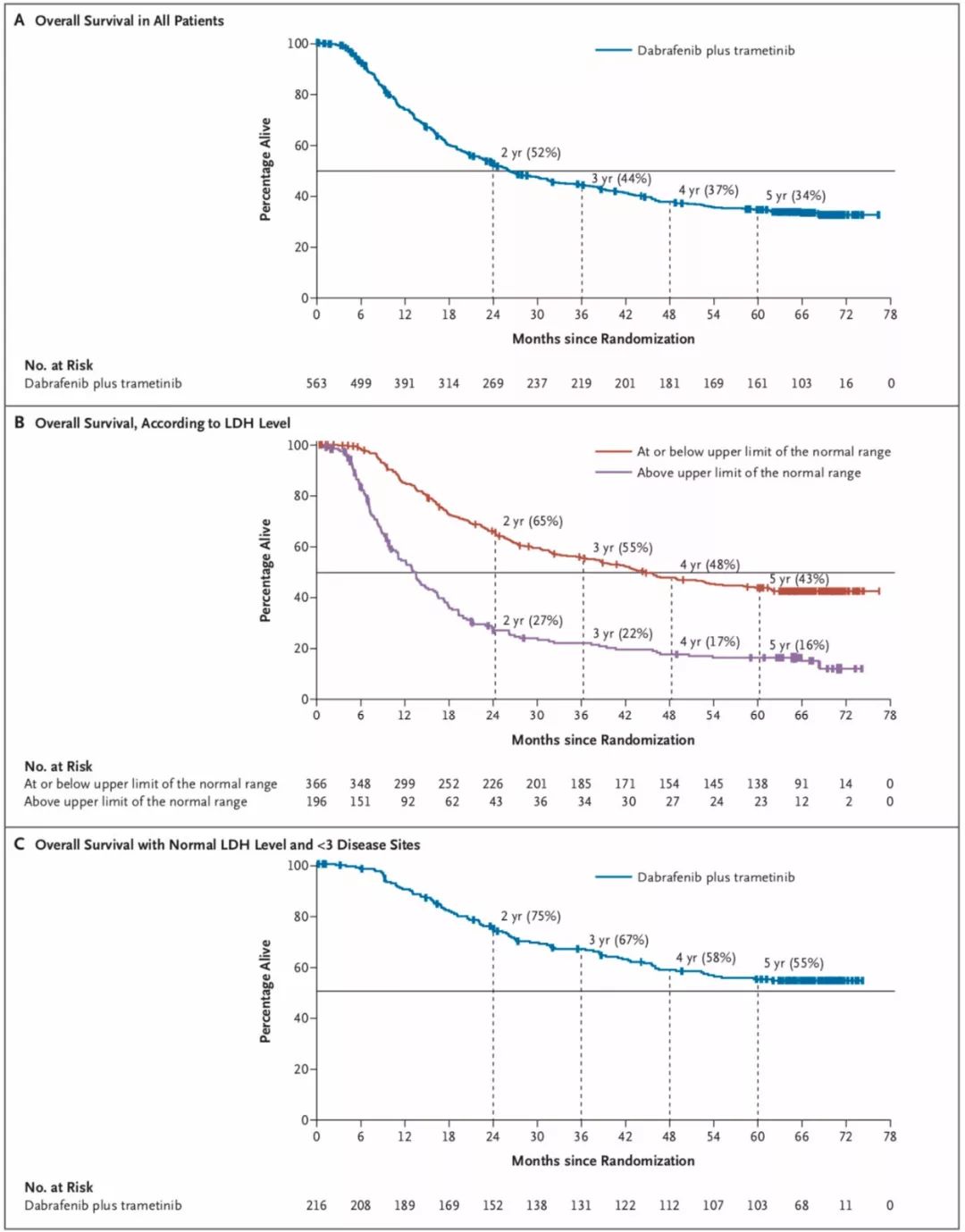 Combi-d和Combi-v研究证明了dabrafenib联合trametinib治疗预后极差的BRAF V600E或V600K突变黑色素瘤的疗效和安全性,并使得部分患者生存超过3年。近期Robert教授在《新英格兰医学杂志》(The New England Journal of Medicine,NEJM)发文,表明5年时仍有1/3患者生存,并再次证明乳酸脱氢酶、肿瘤初始负荷等因素与完全缓解和长生存明显相关。