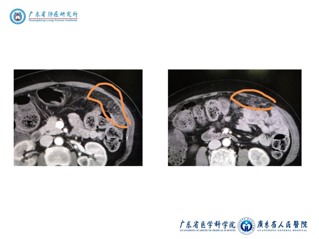 4)二线:AZD3759治疗6周,混合疗效:脑膜强化灶基本消失,上中腹部肠系膜、腹膜改变,考虑多发转移可能性大。盆腔少量积液。肺部稳定。目前1度头晕头痛、1度恶心、2度呕吐。