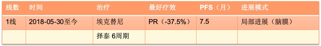 3)一线:凯美纳,PR,PFS 7.5m,胸部维持PR,脑膜转移。