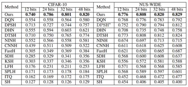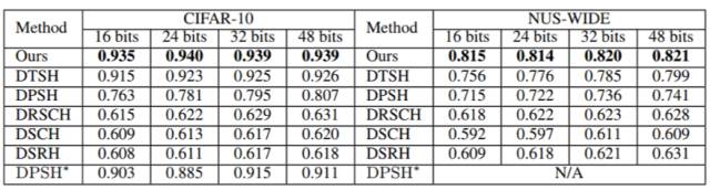 表 1:第一组实验设置下不同方法的 MAP。NUS-WIDE 数据集的 MAP 是根据返回的前 5,000 位邻近值计算的。DPSH * 表示重新运行 DPSH 作者提供的代码。