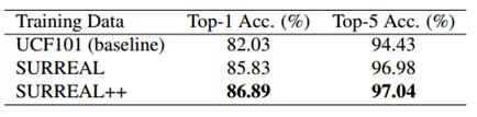 旷视研究员从 Market1501 数据集提取 1500 个纹理,使用 Gul Varol 等人提出的方法合成数据集,称之为 SURREAL++;研究员分别在 SURREAL 和 SURREAL++ 上预训练用于动作识别的 Non-local 网络,并进一步在 UCF101 数据集上微调。实验结果如表 3 所示: