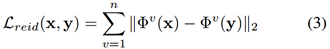 重识别损失是渲染图像与输入图像逐层特征间的距离。在给定一对输入、渲染图像时,研究人员首先将预训练的重识别网络作为 x,y 的特征提取器。进一步,在 ResNet 的 Block 后面,惩罚了各个中间特征激活的距离(其中n = 4,v = 1,...,n):