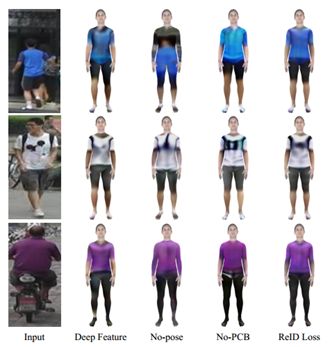 旷视研究院引入重识别方法来监督纹理生成模型。重识别即一种识别和检索人的方法,可作为距离标准衡量不同视角看到的纹理,从而上述第一个问题得到解决;重识别网络可在提取身体特征的同时消除来自姿态与背景信息的干扰,从而解决第二个问题。由此可知,将重识别网络作为监督信息去引导训练纹理生成网络是有效的。
