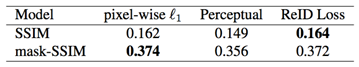 损失函数相当于直接优化 SSIM 分数。虽然 ReID 损失不能直接优化 SSIM 分数,但使用 ReID 损失的 SSIM 分数仍然很高。这证实,ReID 损失确实是有效的。