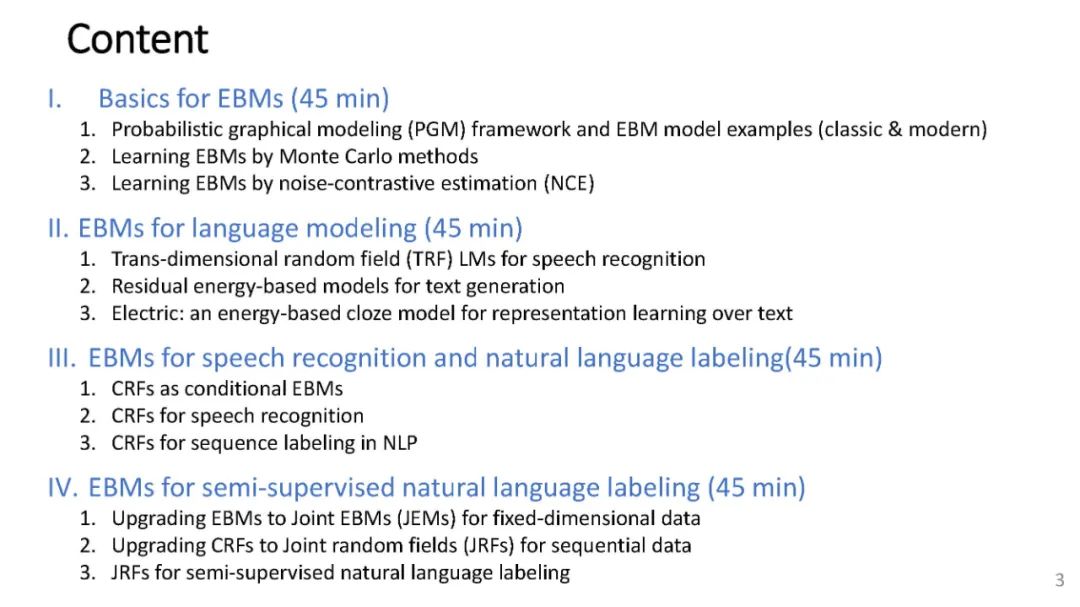 本教程的目的是系统介绍基于能量的模型,包括算法进展和语音和语言处理中的应用,共分为四章。首先,我们将介绍EBMs的基础知识,包括经典模型、最新的神经网络参数化模型,以及从经典方法到最先进的各种学习算法。接下来的三章将分别介绍如何在三种不同的场景中应用EBMs: 1)用于语言建模的EBMs, 2)用于语音识别和自然语言标记的EBMs,以及3)用于半监督自然语言标记的EBMs。此外,我们将介绍开源工具包,以帮助观众熟悉开发和应用基于能源的模型的技术。