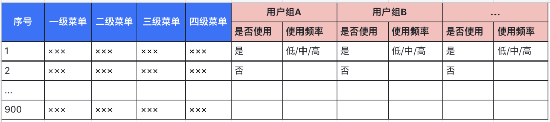 梳理那些没人用的页面,根本就是浪费时间。我们要搞清楚用户到底常用哪些页面,压根不用的页面就不梳理。于是,我们继续梳理页面优先级。将之前整理的页面菜单Excel的列后,再加上目前主要使用系统的各大用户组。