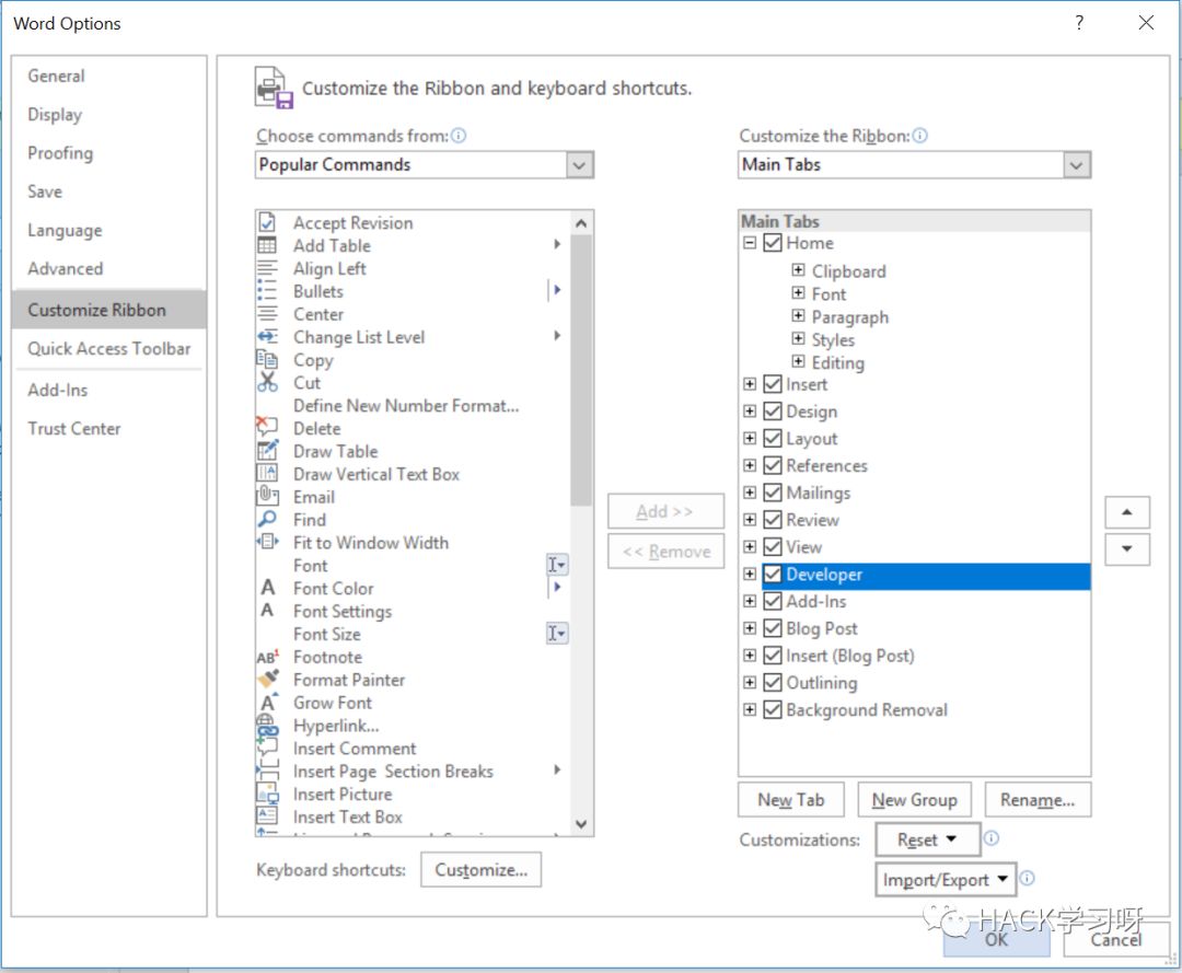 想要使此攻击起作用,我们需要创建一个支持宏的Word模板(.dotm文件扩展名),其中将包含我们的恶意Empire宏。打开Word并勾选功能区上的Developer选项卡使其可见: