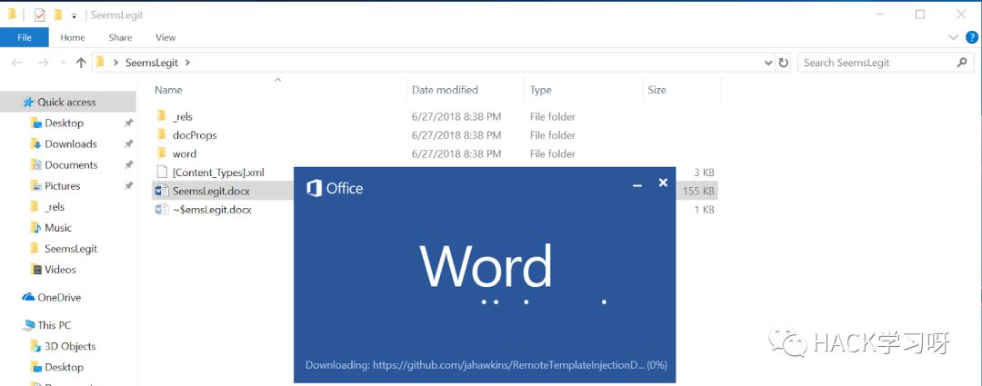 保存此文件后,我们可以将内容压缩回来并将文件重命名为.docx。下次我们打开我们的.docx时,我们可以看到该文件通过HTTPS与我们的托管服务联系,并下载模板:
