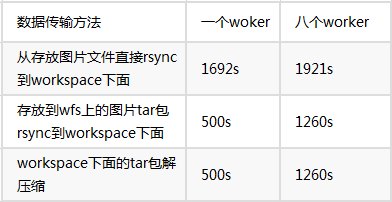比较了几种数据传输的方法,一种是将数据切分成多个tar包存放在wfs上,在训练之前从wfs上传到各个机器;另一种是直接将原始图片数据从我们存放的机器上传到各个训练机器。时间耗时如下: