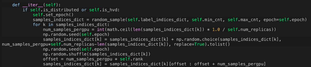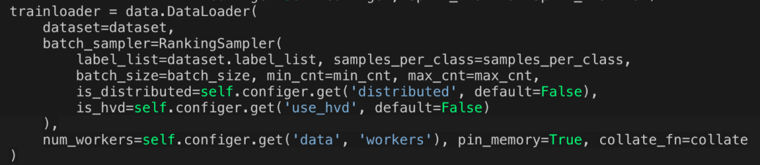 这种方式可以适用于简单的分布式训练任务。但是在识物的检索训练过程中,我们希望dataloader可以做一些平衡采样或者三元组采样,上面的sampler只支持分布式采样。由于pytorch的DataLoader的部分初始化参数之间存在互斥关系,如果自定义了sampler,那么这些参数batch_size,shuffle,batch_sampler,drop_last都必须使用默认值。所以我们重写batch_sampler,将分布式的sampler作为参数传入新构造的batch_sampler,如下所示,