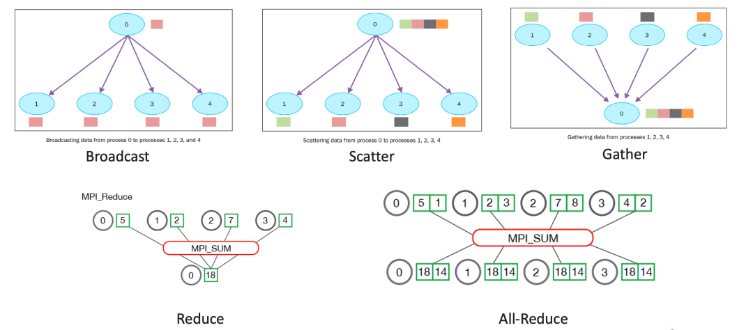 相比于单机多卡,多机多卡分布式训练要保证多台机器之间是可以互相通信的以及不同机器之间梯度可传递。并行任务的通信一般可以分为点对点通信和集体通信。点对点通信这种模式只有一个sender和一个receiver,实现起来比较简单。而涉及到分布式训练,一般是多台服务器,用到集体通信模式,包含多个sender多个receiver。集体通信常用的通信方式主要有下面几个:broadcast、gather、scatter、reduce、all-reduce等。