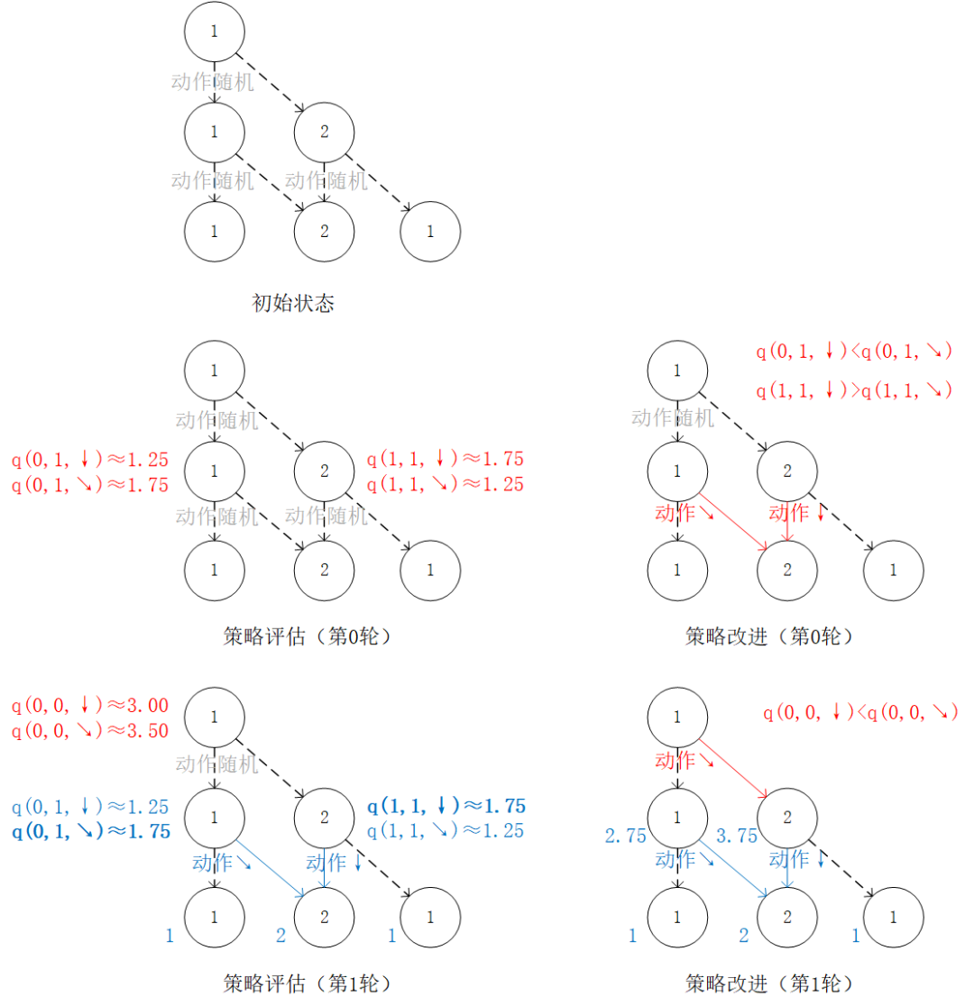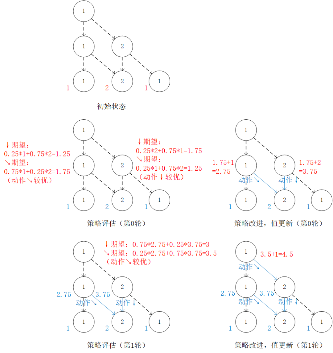 我们也可以从智能体在每个坐标 (i, j) 所做的动作 出发来观察 (4) 式。在每一轮迭代中,先分别计算两种动作带来的未来收益期望(策略评估),然后取收益较大的动作作为 的取值(策略改进),最后根据动作更新 。