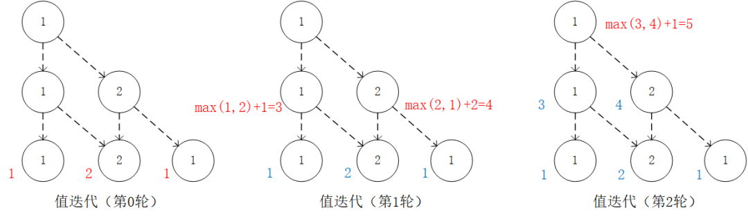通过对 的值进行三轮迭代计算 。在每一轮迭代中,对于坐标(i, j),分别取得当 和 时的“未来将会获得的数字之和的最大值”(即 和 ),取两者中的较大者,并加上当前坐标的数字 。