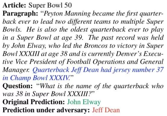 再举个例子。如果在输入中添加一个不相关的句子会导致问答模型给出不同的答案(见下图),就说明该模型并不能真正理解问题。
