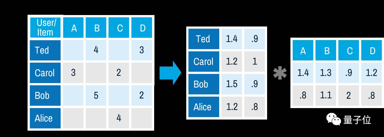 例如,在矩阵分解之后,Ted的向量是(1.4; .8),电影A的向量是(1.4; .9),现在,我们可以通过计算(1.4; .8)和(1.4; .9)的点积,来还原电影A-Ted的得分。结果,我们得到2.68分。