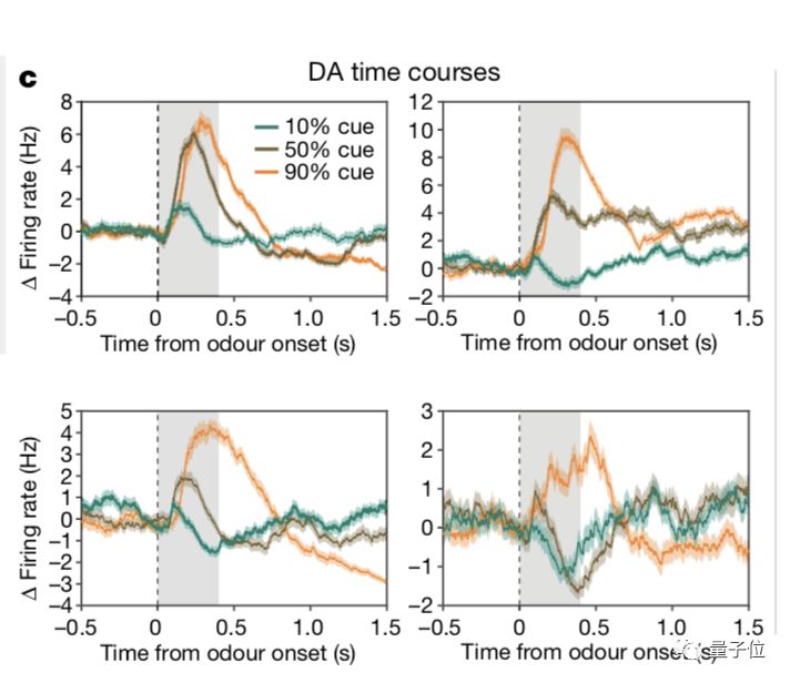 分别是10%、50%、90%的奖赏概率,并同时记录了四个多巴胺神经元的反应。