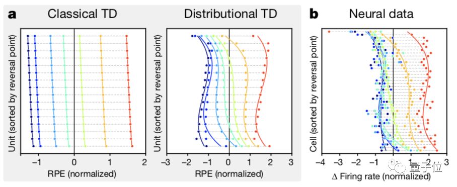记录结果显示,小鼠大脑的多巴胺神经元反转点根据积极程度的不同而不同。符合分布式强化学习的特点(如上图b所示)。