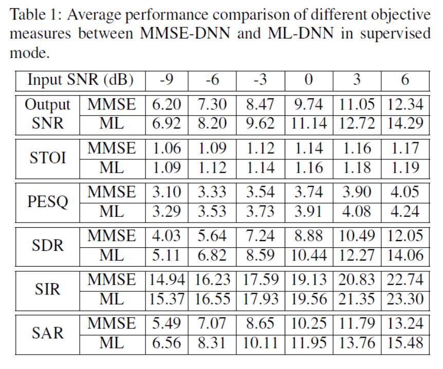 通过实验对比发现,基于该最大似然方法训练的神经网络分离的语音在不同的客观指标上均超过了使用传统的最小均方误差准则训练的神经网络。
