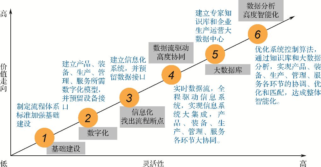 下图为我们推荐的智能制造实施步骤建议,基于智能制造顶层规划设计,从基础建设到实现全面数字化和信息化,以及基于数据流驱动的高度协同实现,最终实现基于大数据分析的高度智能化。