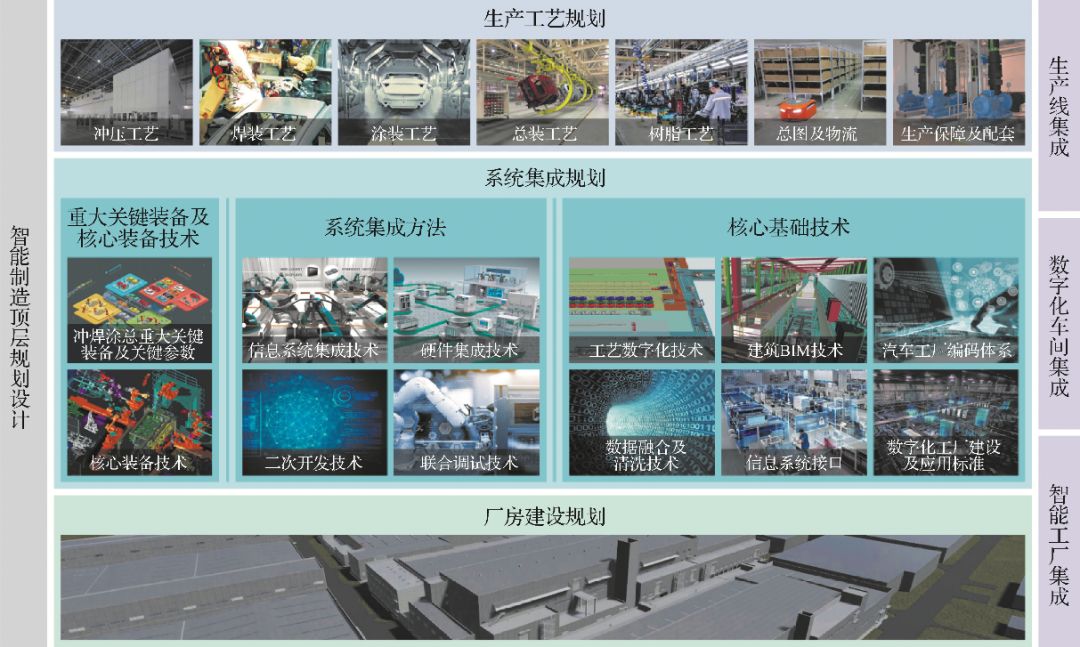 结合工艺规划要求,围绕汽车制造工艺生产特点,从软硬件体系、工程实施等层面梳理汽车工厂重大关键装备及核心装备技术、系统集成方法、核心基础技术。