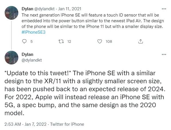 一年之后,他原来的爆料推文之下发表了更新,称采用类似 iPhone XR / 11 设计的 iPhone SE 已被推迟,可能要到 2024 年才会亮相;苹果 2022 年推出的将是 5G 版 iPhone SE,规格更高,设计与 2020 款一样。