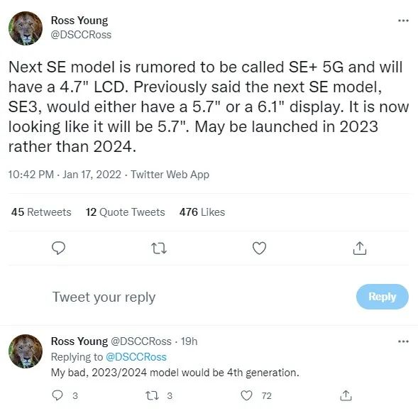 第三则爆料来自显示屏供应链咨询的 Ross Young,它表示今年的 iPhone SE 将被称为“iPhone SE+ 5G”,搭载 4.7 英寸 LCD 显示屏,而所谓的“iPhone SE 3”实际上是 SE 4,会有 5.7-6.1 英寸大屏,现阶段看更可能是 5.7 英寸,预计 2023 年发布而不是 2024 年。
