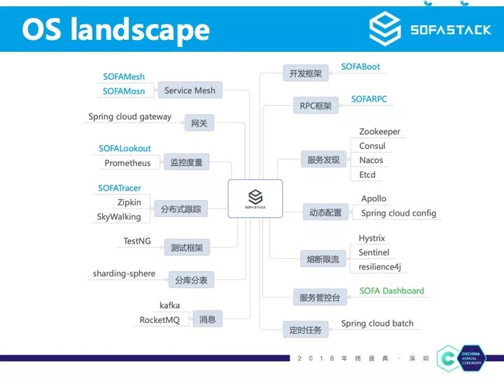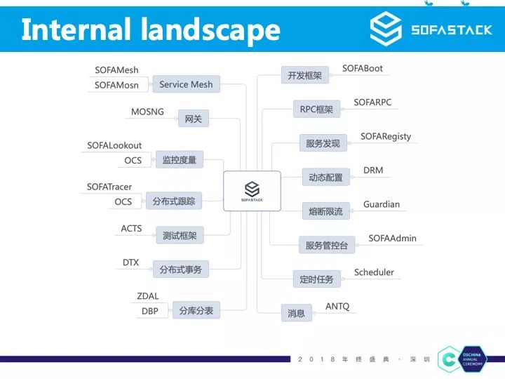 另外这张是我们的 OpenSource Landscape,目前只开源了部分组件,部分组件还在开源准备中,虽然不少内部组件没有开源,但是在每个微服务领域我们都会打通当前已经开源的比较成熟的组件。例如微服务里的服务发现,我们没有开源内部的 SOFARegistry,但是我们对接了 ZooKeeper/etcd/nacos 等业界成熟的注册中心产品,又例如分布式跟踪,我们虽然开源了自己的 SOFATracer,但是在 SOFARPC 我们也提供 skywalking 作为我们的分布式跟踪的实现。通过保持和业界众多优秀开源产品的兼容性,使得 SOFAStack 有更多可能。