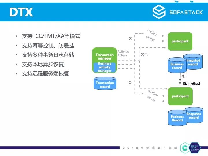 DTX 还支持幂等控制、防悬挂等特性,事务日志兼容多种日志存储实现,事务也支持从本地异步恢复或者远程服务端恢复。