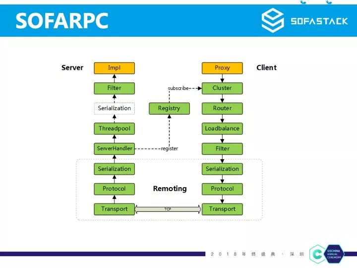 SOFARPC 和其它的开源的 RPC 框架一样,做了很多分层很多的模型抽象,例如图中的 Filter/Router/Cluster/Loadbalance/Serilization/Protocol/Transport 等这些模型。