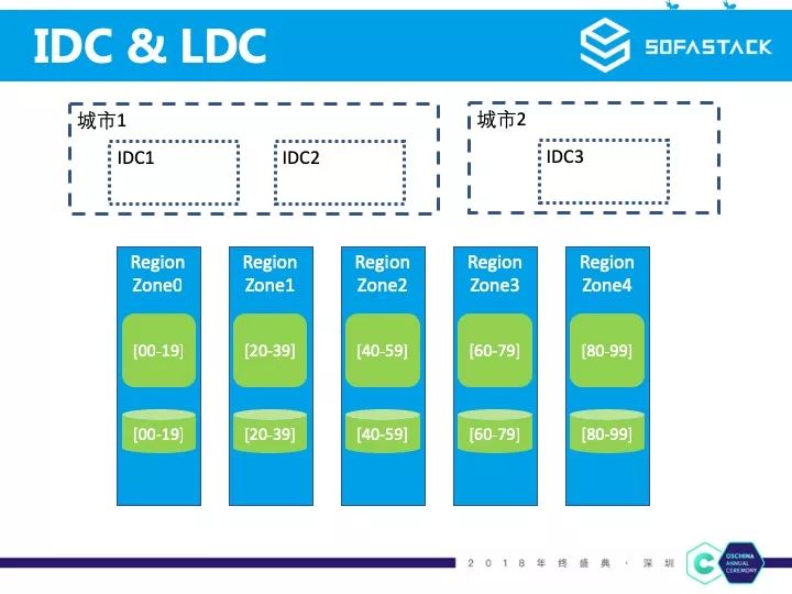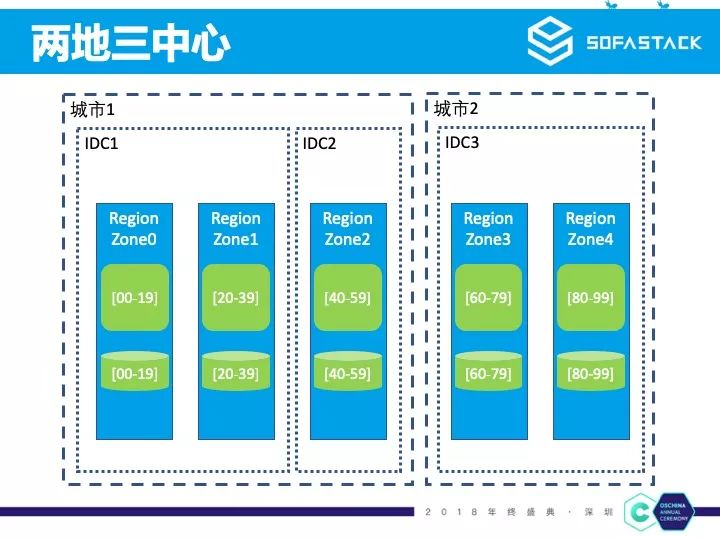 我们把这种逻辑单元称之为 RegionZone。在实际的部署过程中,物理数据中心 IDC 和 逻辑单元的数量没有完全的对等关系。例如图中我们物理机房可以是两地三中心,而 RegionZone 则是分为五个。