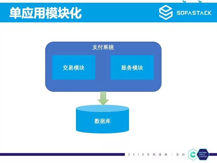 这个是支付宝最早的架构示意图,可以看到当时支付宝只是电商后台的一个支付系统,是一个单体应用,里面简单的分了几个业务模块,连的也是一个数据库。但随着业务规模的不断扩展,单系统架构已经无法满足业务需求。