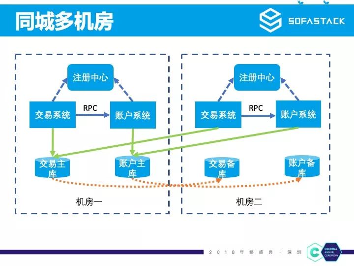 业务还是不断扩展,系统也越来越多,当系统节点到一定数量的时候,单个物理机房已经无法承受。另外考虑到同城容灾的问题,支付宝就在同城再扩建另外一个机房,通过专线部署为一个内部网络,然后将应用部署上去。同城多机房会引入一个跨机房远程访问的问题,相比同机房调用,这个延迟损耗一定是更高的。远程访问主要包括两种:RPC 调用和数据库访问。为了解决 RPC 跨机房调用的问题,支付宝的工程师选择的方案是在每个机房都部署注册中心,同机房优先调用本机房服务的方式,也就变成图中的部署模式。但是数据库跨机房访问的问题,在这个阶段并没有解决。