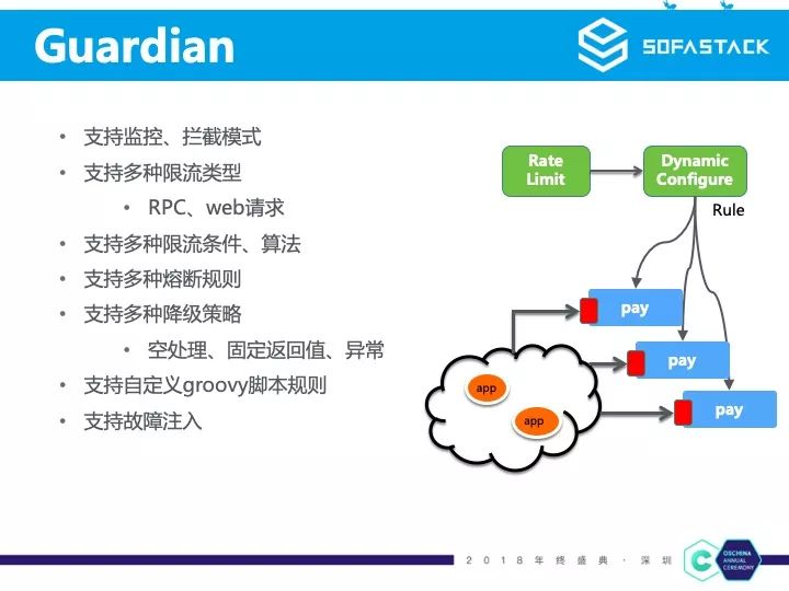 它支持监控模式(只记录不拦截)和拦截模式。支持多种场景的限流例如RPC请求、Web请求等。支持令牌桶、漏桶等多种限流算法。支持限时熔断、降级等多种熔断规则。支持空处理、固定返回值、抛出异常等降级策略。有时候如果这些规则过于复杂,用户可以在管理端配置自定义 groovy 脚本,规则将通过配置中心下发到各个拦截点。Guardian 同时还支持故障注入操作,用于日常的一些应急演练,检测系统的健壮性等等。