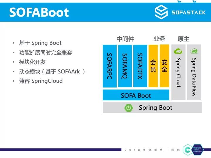 SOFABoot 是基于 Spring Boot 的,我们对其做了功能扩展,同时也保持完全兼容。SOFABoot 提供了基于 Spring 上下文隔离的模块化开发、基于 SOFAArk 的类隔离/动态模块、中间件和业务日志框架隔离等能力。由于 Spring Cloud 也是基于 Spring Boot 的,所以 SOFABoot 和 Spring Cloud 体系也是完全兼容的。我们将 SOFAStack 下的中间件都作为 SOFABoot Starter,同时一些会员、安全等基础业务我们也作为 Starter 供各个应用方便的集成使用。