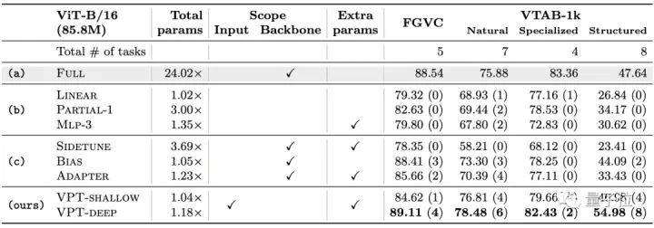 和其他微调方法相比(b、c组),VPT-Deep的性能则全部胜出。