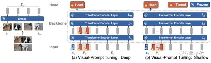 具体来说,比起全面微调,VPT受最新大型NLP模型调整方法的启发,只在输入空间中引入少量可特定某任务训练的参数(不到模型参数的1%),同时在训练下游任务期间冻结(freeze)预训练模型的主干。